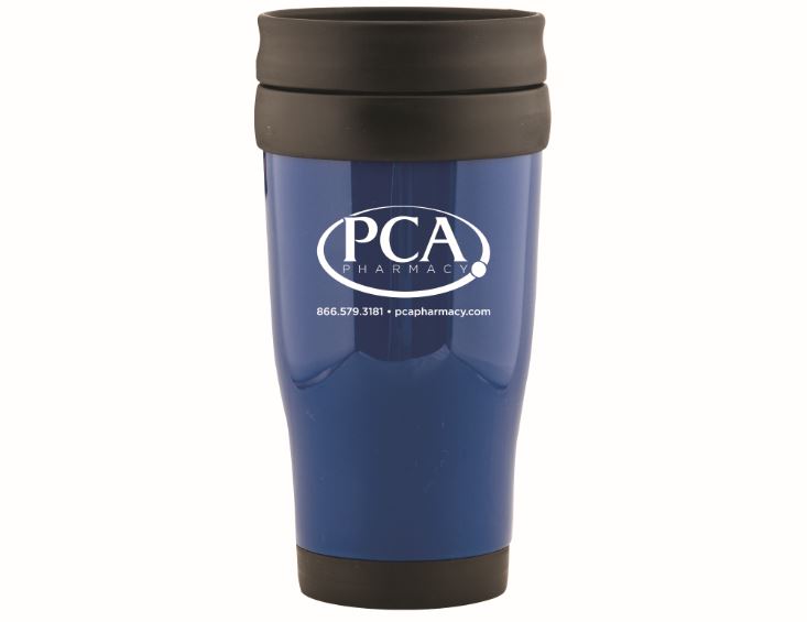 16 oz Cafe Tumbler. 2 sided logo is standard. Double wall insulated. Plastic inner wall. 4-station thumb-slide lid. Hand wash recommended and not intended for microwave use.